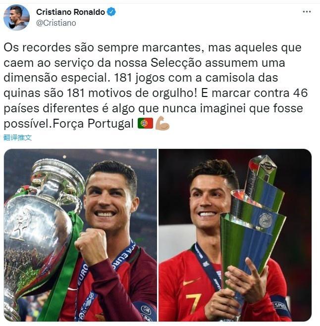 C罗写道:“181场比赛,181个进球是个值得骄傲的纪录,但是也不能忘记我的队友。能对46个不同的对手进球是我从未想过的事情。不要止步于此,让我们为更多而战!前进葡萄牙!”