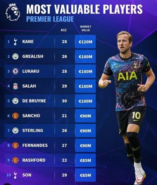 178直播10月10日讯 德国转会市场网今日更新了英超球员身价,凯恩1.2亿欧元全联赛第一。