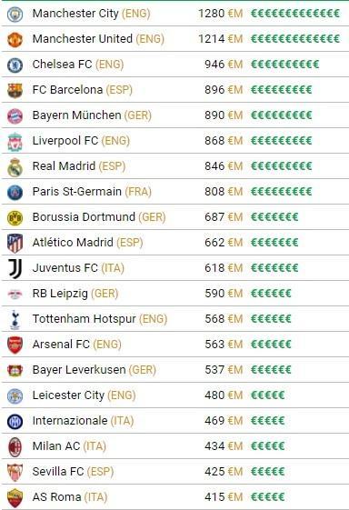 178直播10月05日讯足球天文台今日盘点了五大联赛球队的身价,曼城和曼联突破12亿欧元排名前二,前10中有4支英超球队,而且没有意甲球队。