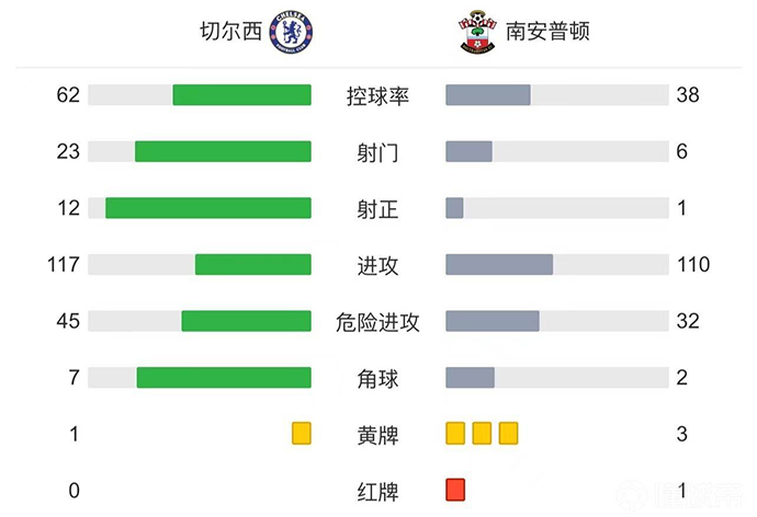 178直播讯:北京时间10月2日22:00,英超第7轮,切尔西坐镇主场迎战南安普顿。上半场,小查洛巴头球破门首开记录,麦卡锡多次作出扑救,卢卡库进球被吹,维尔纳头球破门被吹。下半场,沃德-普劳斯点射破门后染红离场,维尔纳破门再次领先,奇尔韦尔破门扩大比分,全场比赛结束。切尔西3-1南安普顿。
