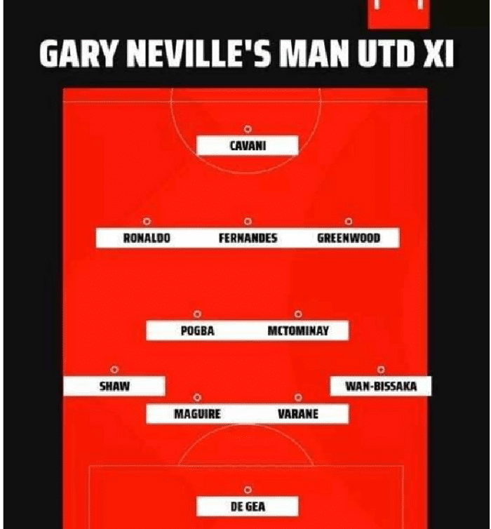 内维尔给出的建议是踢4231阵容,其中门将位置上依然是德赫亚,而后防线上四人组则是比萨卡、瓦拉内、马奎尔和卢克肖;中场双后腰是麦克托米奈和博格巴,前腰位置上是B费,而前场三叉戟C罗和格林伍德在两侧,卡瓦尼在中路。这是内维尔给出的建议,不过个人认为,这样排兵布阵真的不怎么样啊,如果真的用这套阵容去踢,估计曼联会很困难。