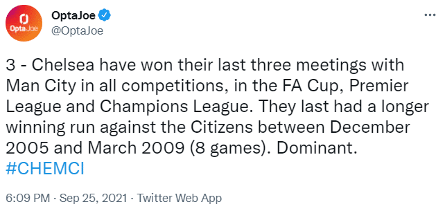 这是自2005年-2009年以来切尔西对曼城最长的连胜纪录,在之前那段期间,切尔西曾对曼城取得8连胜。