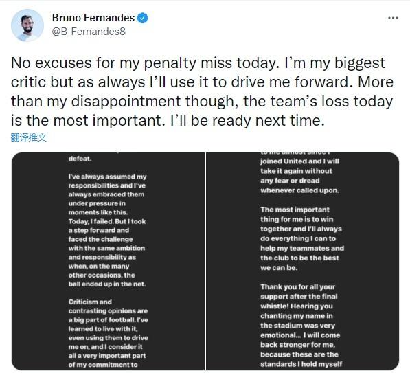 赛后他发文:“我今天罚丢点球没有借口。我是自己最大的批评者,但和往常一样,我会利用这次经历激励自己前行。但球队今天的失利才是最主要的,这超越了我的失望之情。下次我会准备好的。”
