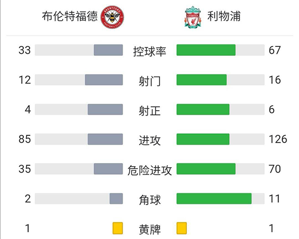 全场比赛结束,最终利物浦3-3战平布伦特福德。