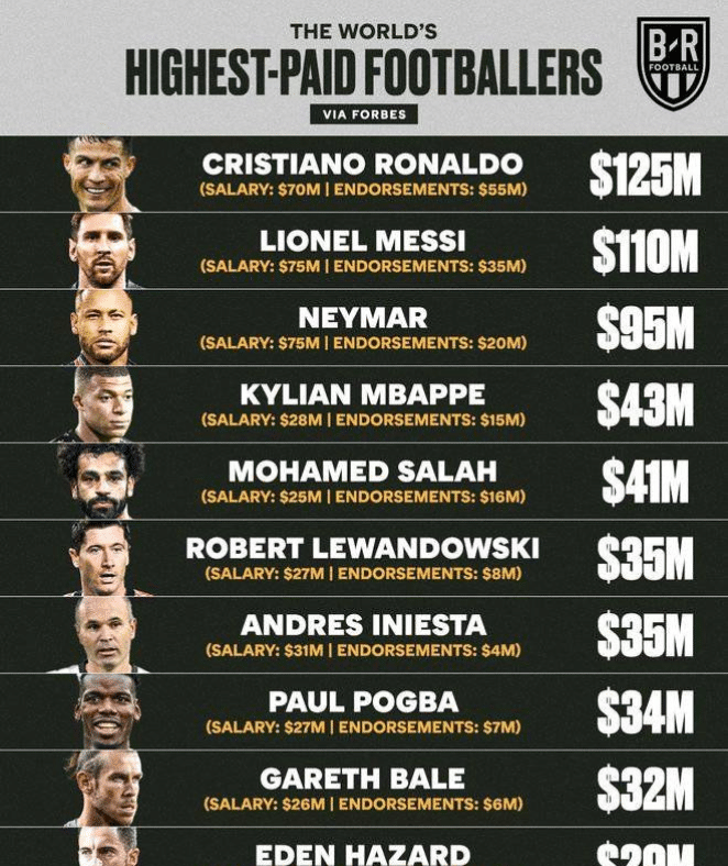 其中,如图,收入最高的C罗年收入1.25亿美元,随后是梅西的1.1亿美元,内马尔的9500万美元。第四是姆巴佩的4300万美元,第五是萨拉赫的4100万美元,第六是莱万和伊涅斯塔的3500万美元,第八是博格巴的3400万美元,第九是贝尔的3200万美元,第十是阿扎尔的2900万欧元。而这些收入是球员的工资、代言等各项收入的总和。