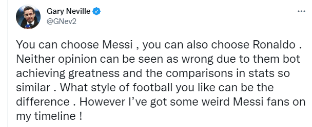 178直播讯 9月15日消息,加里-内维尔表示,选择梅西或C罗作为历史最佳都没错,但一些梅西球迷很古怪。