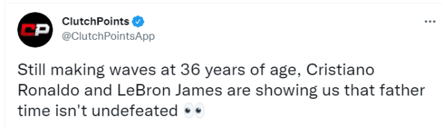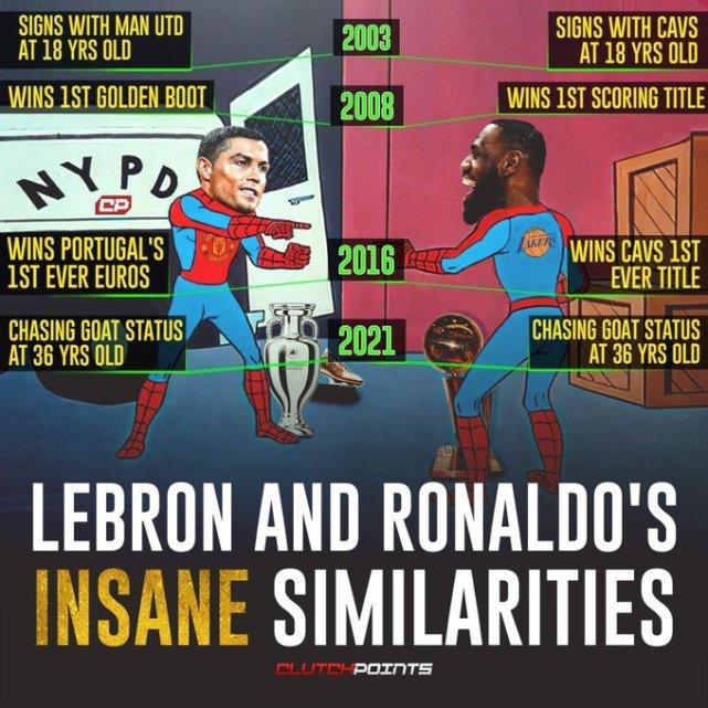178直播9月12日讯今日,美媒ClutchPoints晒出詹姆斯与足球超级巨星C罗职业生涯轨迹对比图,感慨两位传奇老将之间的一些惊人相似之处。ClutchPoints还配文写道:“36岁的克里斯蒂亚诺-罗纳尔多和勒布朗-詹姆斯仍在掀起波澜,他们告诉我们,时光老人并非不可击败。”
