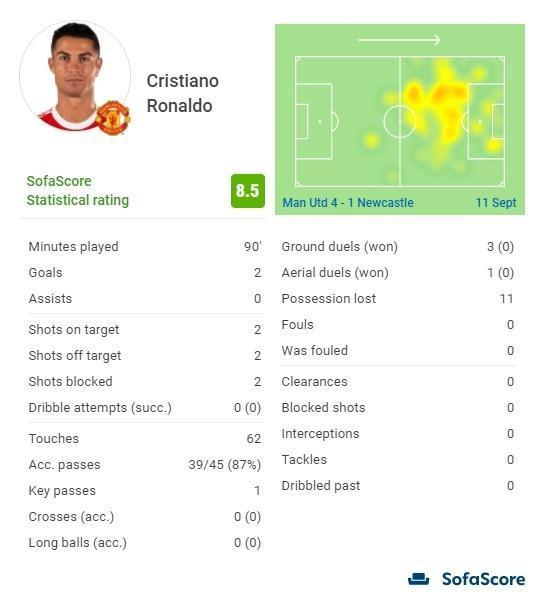 178直播9月12日讯消息,C罗在回归曼联的首场比赛中6次射门打进2球,获评8.5分。