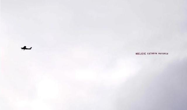 这个女权组织叫 Level Up,他们雇飞机拉横幅飞过老特拉福德,提醒人们不要忘记凯瑟琳-马约加,横幅上写着“请相信凯瑟琳-马约加”。
