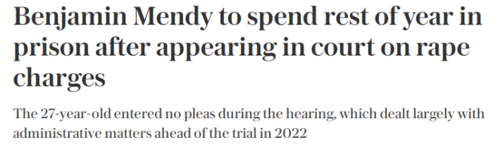 178直播9月12日讯《每日电讯报》消息,曼城后卫本哈明-门迪今年将在监狱里度过,明年1月24日接受审判。