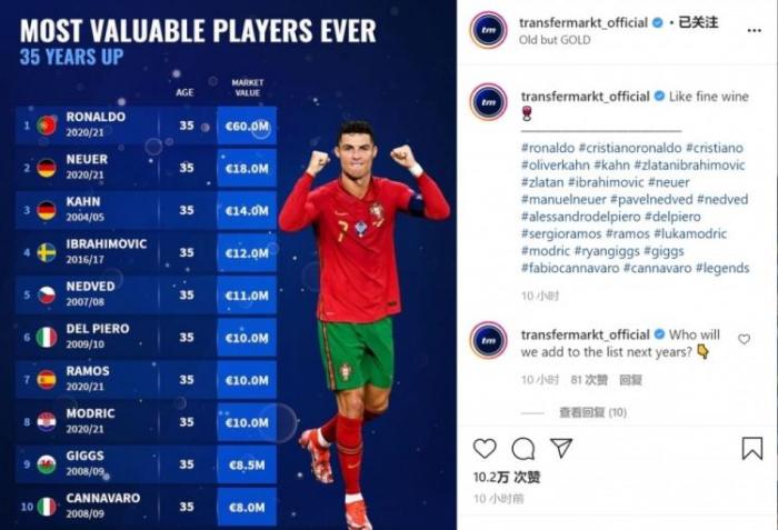 178直播9月11日讯 今日,德国转会市场网盘点足坛史上球员在35岁时的身价排行,C罗以6000万欧排在第一位。