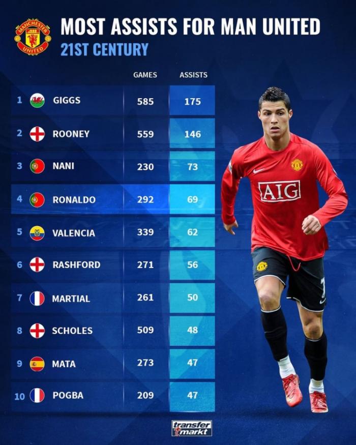 而排名第六的是拉什福德,他271场比赛贡献了56次助攻,第七是马夏尔,他261场比赛贡献了50次助攻,第八是斯科尔斯,他509场比赛贡献了48次助攻,第九是马塔,他273场比赛贡献了47次助攻,第十是博格巴,他209场比赛贡献了47次助攻。可以看出,不少曼联现役的球员都上榜了,而他们的数据还在继续上升,不知道他们离开曼联的时候可以把数据该写道多少。