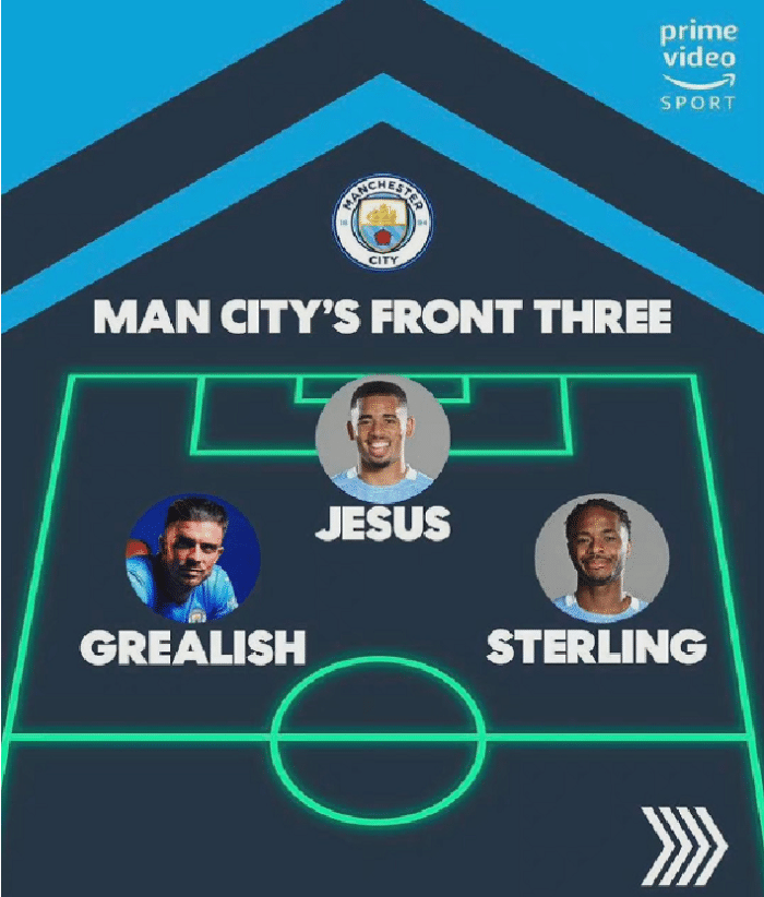 如图,曼城的前场三叉戟是热苏斯居中,格拉利什在左,斯特林在右。这个阵容,热苏斯拉低了上限,不过曼城的强大并不在于球队的前场,而是他们中场强大的制造机会能力,球队的中场德布劳内等人,可以创造诸多的机会,这也给了曼城前锋挥霍进球机会的底气,所以即便曼城的前场三叉戟不够强大,他们依然可以打进诸多进球。