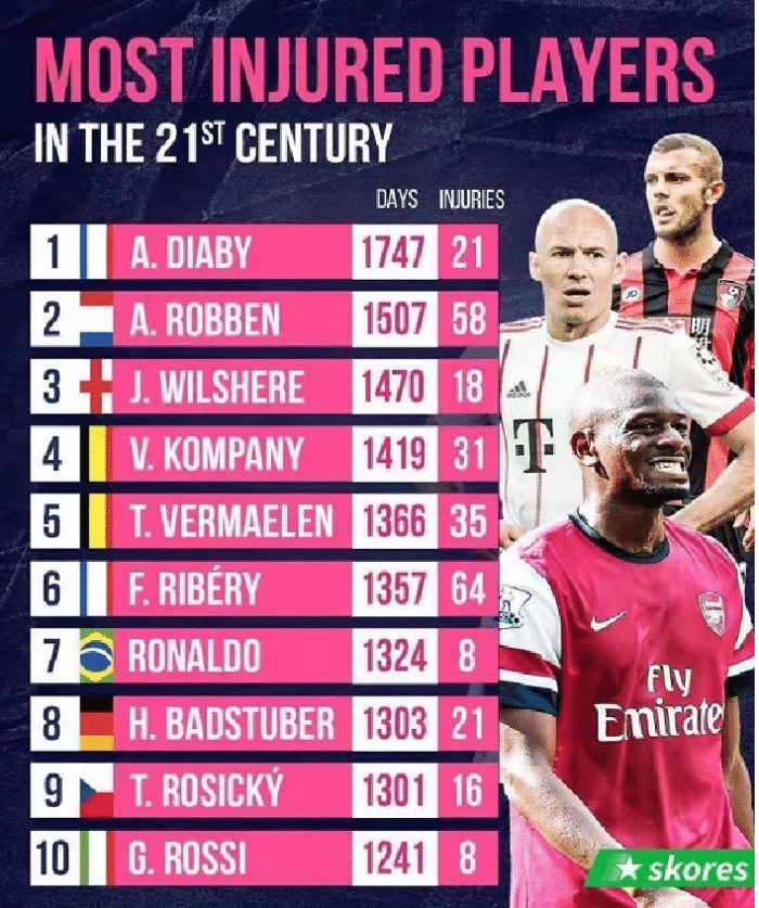 如图,本世纪足坛最大的玻璃人非迪亚比莫属,当初温格签下了迪亚比,他的表现也让人眼前一亮,甚至不少人都认为,他会比维埃拉更加出色。不过,伤病击垮了迪亚比,他职业生涯受伤了21次,累积伤停1747天,也成为了本世纪足坛最大的玻璃人。而第二的是罗本,他职业生涯受伤了58次,累积伤停1507天。不过,罗马去到拜仁之后,受伤就比较少了,而且他退役后复出,一下就休息了半年多,这也让罗本的伤停天数增加了不少。