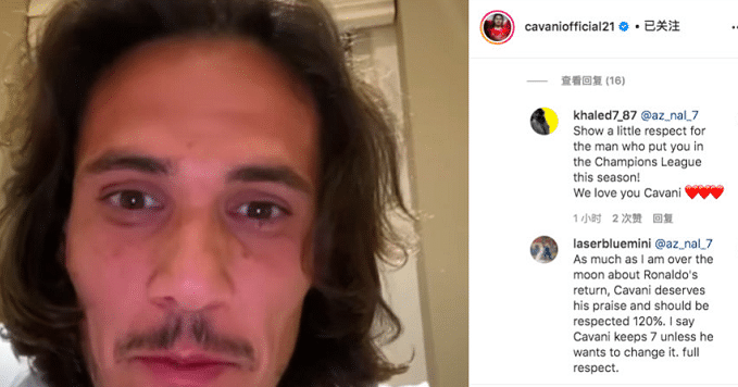 C罗的球迷们看到这样的消息之后不干了,他们在社交媒体上围攻卡瓦尼,基本上所有的言论都是令他交出曼联传奇的7号战袍,称这是属于C罗的号码,卡瓦尼不配穿,需要归还之类的话。