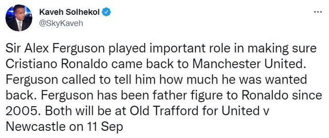 178直播8月28日讯 据天空体育记者Kaveh Solhekol报道,弗格森在C罗回归曼联这笔交易中起了很大作用。