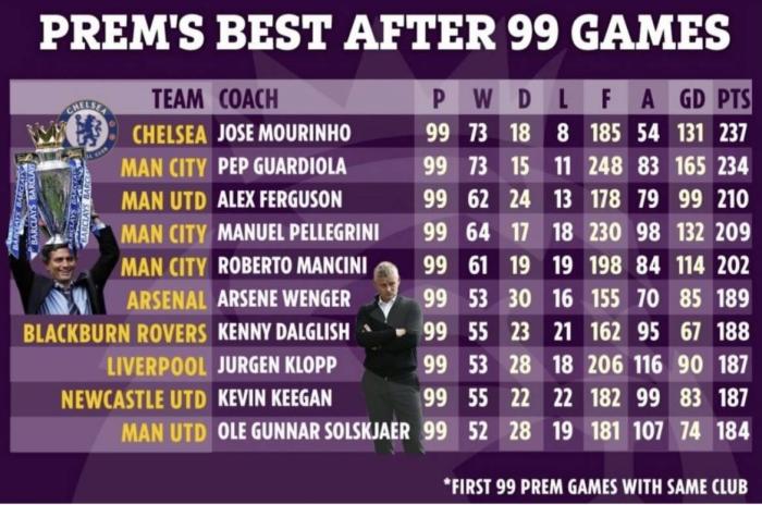 如图,其中,穆里尼奥前99场比赛的成绩是最好的,穆帅拿到了73胜18平8负的战绩,打进185球丢掉54球,拿到了237分。穆帅的球队是所有球队中丢球最少的,而他执教的球队是切尔西。而排名第二的是瓜迪奥拉,他执教曼城的前99场比赛,73胜15平11负,打进248球丢掉83球,拿到234分,瓜帅的球队是所有球队中进球最多的一个。