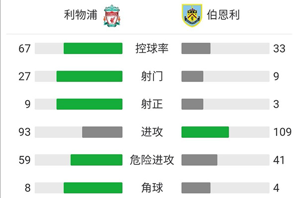最终全场比赛结束,利物浦2-0伯恩利。