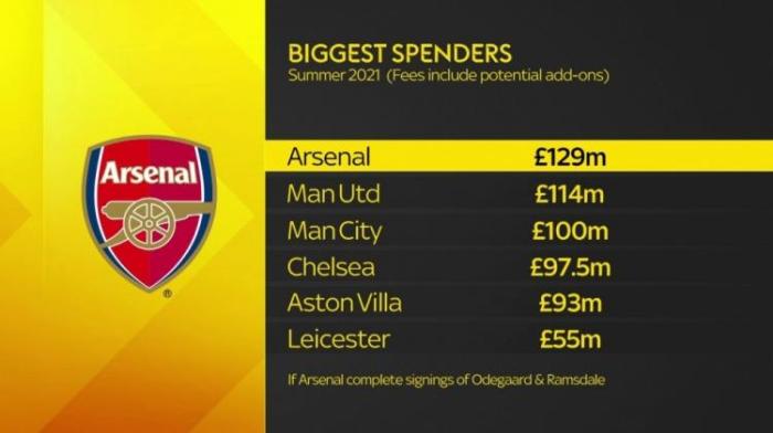 178直播讯 由于阿森纳即将签下厄德高和拉姆斯代尔,因此,有媒体统计,如果加上这两笔交易的转会费,阿森纳今夏的转会支出将达到1.29亿英镑,位列英超球队第一。