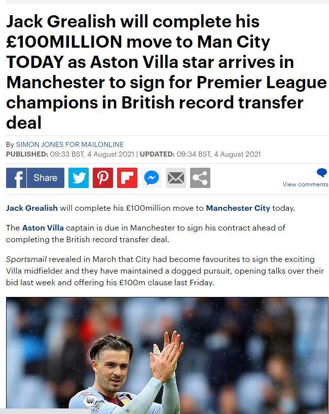 178直播讯 今日,据英媒《每日邮报》消息,阿斯顿维拉队长格拉利什今天将与曼城签约,转会费1亿英镑。