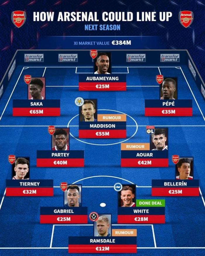 在这份阵容中,除了新援本-怀特外,还有多个阿森纳绯闻新援,包括莱斯特城中场麦迪逊,里昂中场奥亚尔和谢菲联门将拉姆斯代尔。