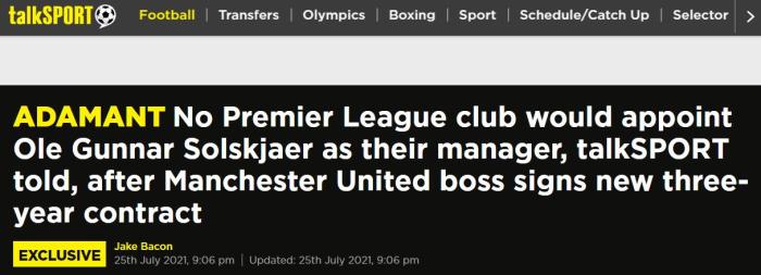 曼联续约索尔斯克亚的举措,遭到不少足球评论员的批评,因为俱乐部压根不必担心索帅会被其他豪门抢走。按照「talkSPORT」电台的阿历克斯·克鲁克(Alex Crook)——拥有欧足联青训教练证书,也曾在大连一方和国奥任职的教练——的说法,连其他英超球队也没有一支会考虑聘请挪威人。