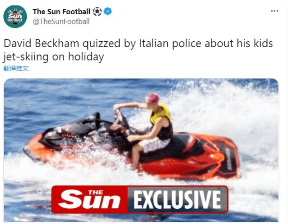 178直播讯 《太阳报》消息,因为让未成年的儿子克鲁兹和女儿小七驾驶摩托艇,贝克汉姆被意大利警方问询。