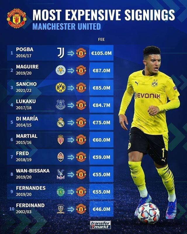 178直播讯 北京时间7月23日,曼联官方宣布桑乔正式加盟球队,这笔交易花费曼联8500万欧元。随即,德国转会市场盘点了曼联引援转会费榜。