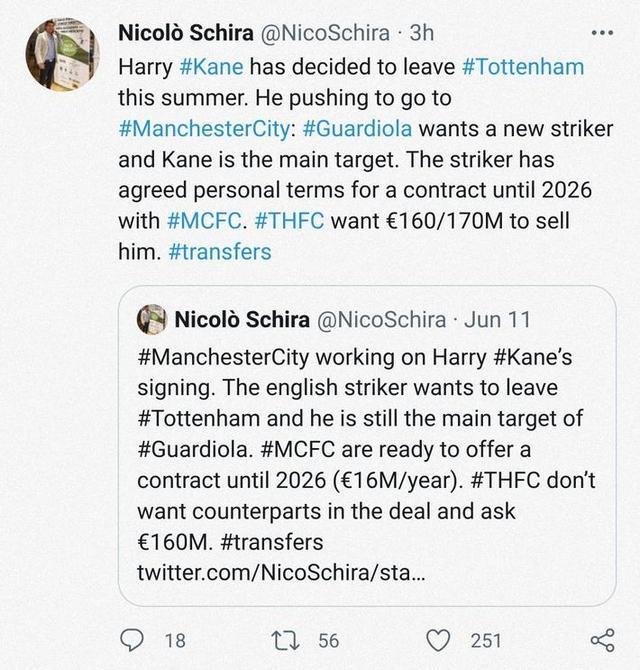斯基拉表示:“凯恩已经决定今夏离开热刺,转会曼城。瓜迪奥拉有意签下一名前锋,凯恩是他的第一目标。凯恩与曼城已经就个人条款达成一致,双方将签约至2026年,而热刺的报价为1.6亿到1.7亿欧元。”