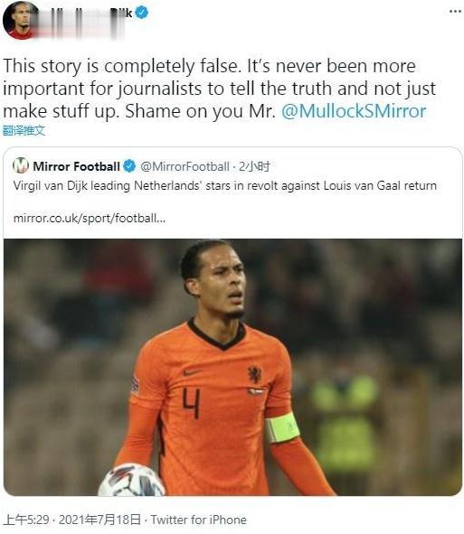 178直播讯 北京时间7月18日,此前据《镜报》报道,范迪克带头反对范加尔重返荷兰执教,范迪克在社交媒体上对其进行了辟谣。