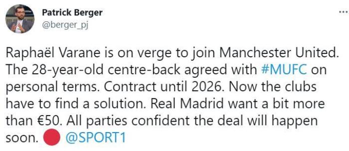 该记者表示,瓦拉内即将加盟曼联,双方已经达成协议,瓦拉内将与曼联签约至2026年。