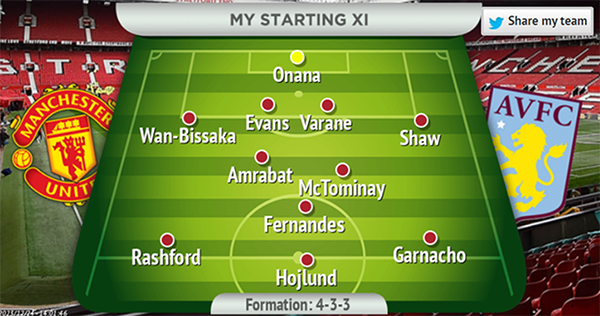 英国《曼彻斯特晚报》预测,本场瓦拉内、拉什福德和阿姆拉巴特可能回到首发阵容。其预计主力为:奥纳纳/万比萨卡,瓦拉内,埃文斯,卢克·肖/阿姆拉巴特,麦克托米内,布鲁诺·费尔南德斯/拉什福德,霍伊伦德,加纳乔。
