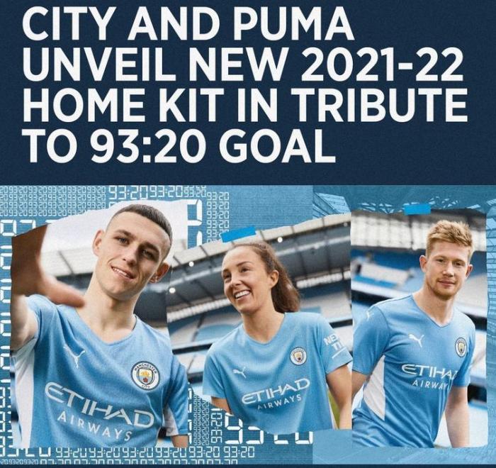 数字时钟暗纹图案将贯穿整件球衣,以此来纪念93:20史诗绝杀进球,向那个传奇赛季的球员们致敬。主场球衣将搭配天蓝色球裤和环纹球袜。