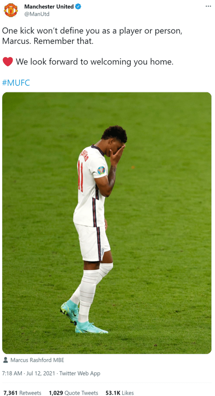 178直播讯 今天凌晨,拉什福德在欧洲杯决赛中罚丢点球,赛后曼联官推发文安慰了这名球员。