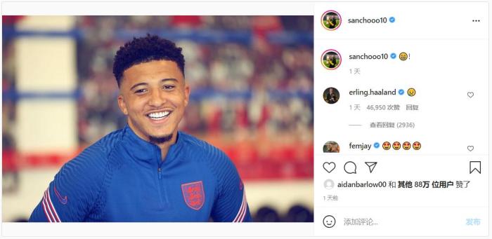 本周,20岁的哈兰德首次对合作18个月的桑乔转会发表评论。曼联新援在社交网站发布一张自己在欧洲杯上备战的照片,而哈兰德跟帖,配上悲伤落泪的表情。