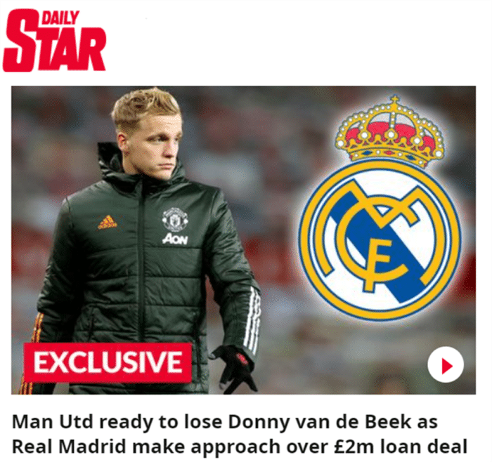 《每日星报》报道称,曼联的要求是,皇马在12个月后必须买断范德贝克,并且支付红魔已经为他付出的3500万转会费。
