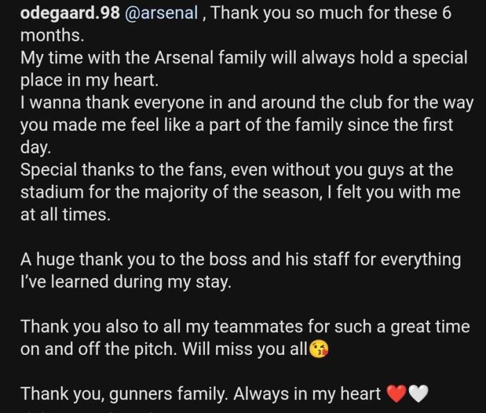 178直播讯北京时间7月4日,厄德高结束了阿森纳租借生涯,挪威人在Ins上发文告别阿森纳。