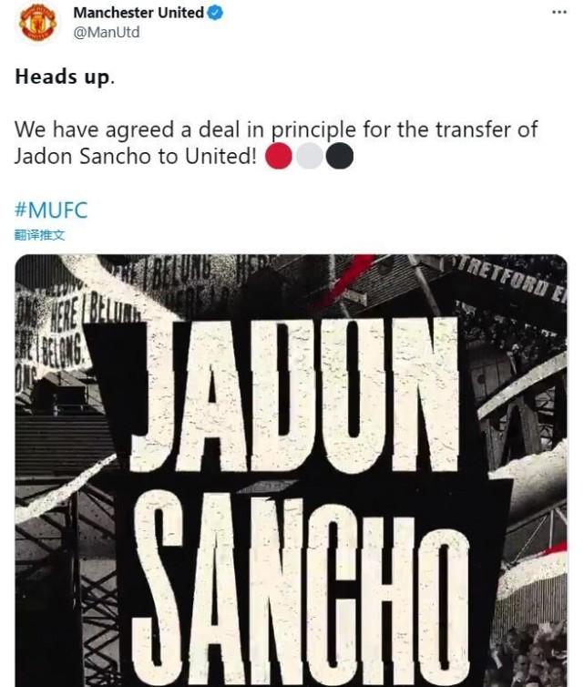 178直播讯 北京时间7月1日晚,曼联官方宣布,与多特就桑乔转会达协议。曼联将为桑乔支付8500万欧元(7300万镑)的转会费。
