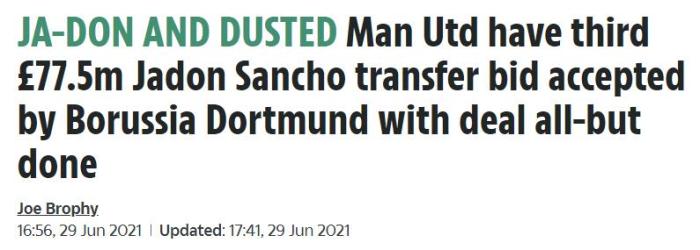 其报告披露,曼联曾有7200万欧元(6190万英镑)和7800万欧元(6710万英镑)遭到拒绝,但第三次报价被接受。过去几天里,多特蒙德首席执行官汉斯-约阿希姆·瓦茨克与曼联的执行副主席埃德·伍德沃德进行了很好的会谈,双方已经达成协议。