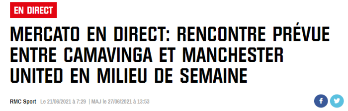 RMC称,卡马文加是曼联今夏的重点引援对象,他们已经官方表示了对卡马文加的兴趣。下周中,曼联将和卡马文加的经纪人面谈。