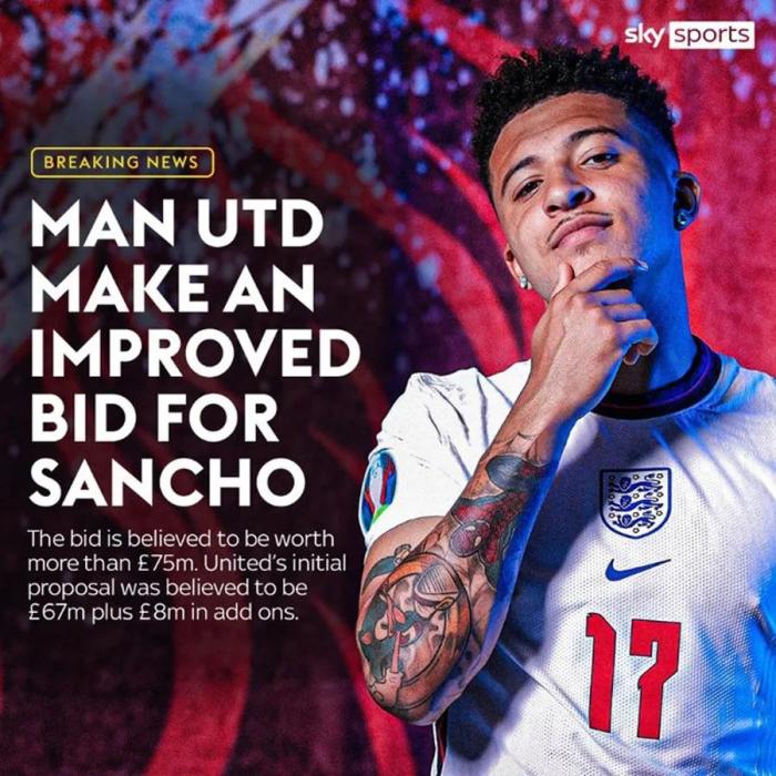 178直播讯 据包括天空体育在内的英媒报道,曼联第二次向多特蒙德报价求购桑乔,出价至少超过了7500万英镑,比本月初被拒绝的6700万英镑固定金额+800万英镑浮动条款有明显提升。
