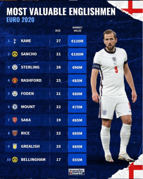 178直播讯 德国转会市场日前盘点了英格兰国家队的身价排行,其中凯恩1.2亿欧元排名第一。