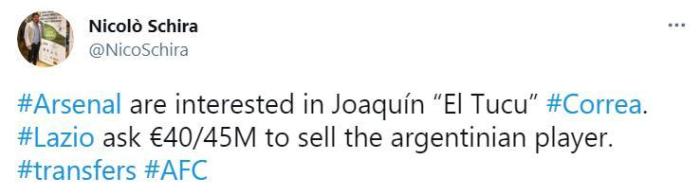 斯基拉表示,阿森纳对华金-科雷亚感兴趣,而拉齐奥方面对阿根廷人的要价在4000万-4500万欧元之间。