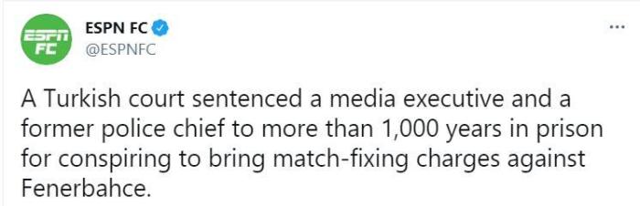 ESPN表示,这两个人的罪名是密谋对土超球队费内巴切操纵比赛的指控。