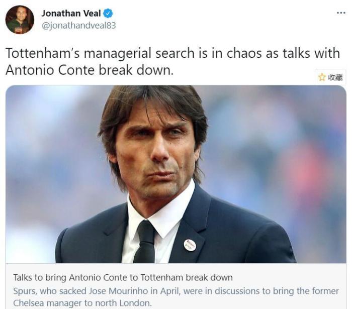 178直播讯 据热刺跟队记者JonathanVeal报道,热刺与孔蒂的谈判已经破裂。
