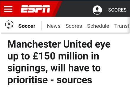 178直播讯 北京时间5月29日,据ESPN消息,曼联今夏准备净投入1-1.5亿英镑来进行引援。