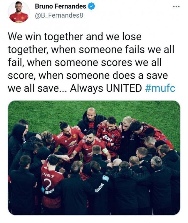 B费写道:“无论输赢,我们都团结在一起。当有人失败时,我们会一起承担失败;当有人破门得分时,我们会一起得分;当有人做出扑救时,我们一起拯救球队。曼联永远团结在一起!”