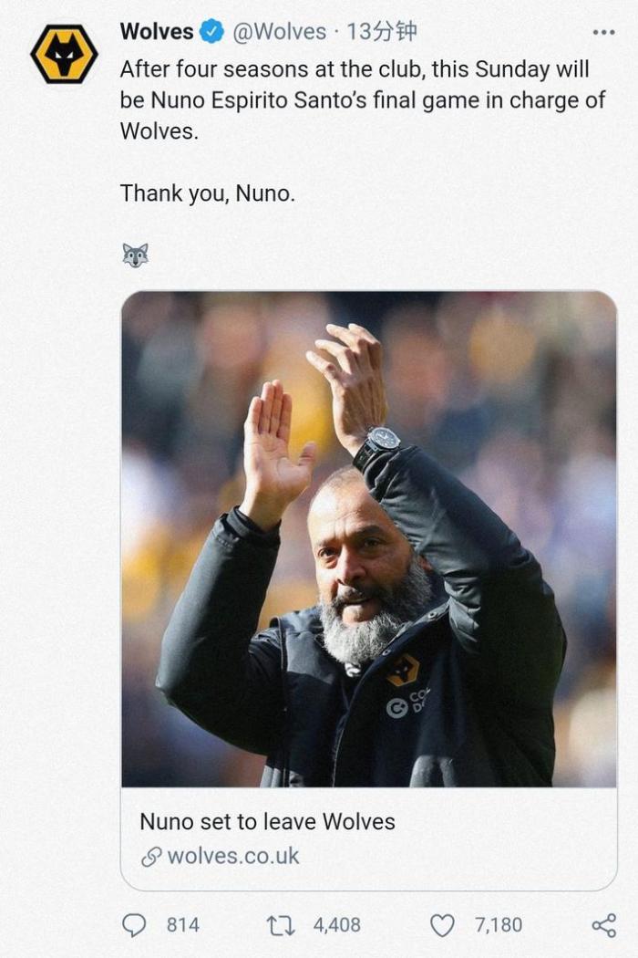 178直播讯 努诺此前曾执教过瓦伦西亚、波尔图等俱乐部。2017年7月1日担任狼队主教练,在此期间,努诺率队重返英超,并取得了英超第七的好成绩。