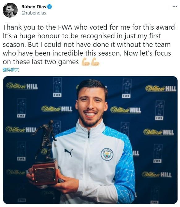 178直播讯 北京时间今天,曼城后卫鲁本-迪亚斯当选英格兰足球记者协会(FWA)评选的英超最佳球员,随后迪亚斯在推特上表达了自己的感想。