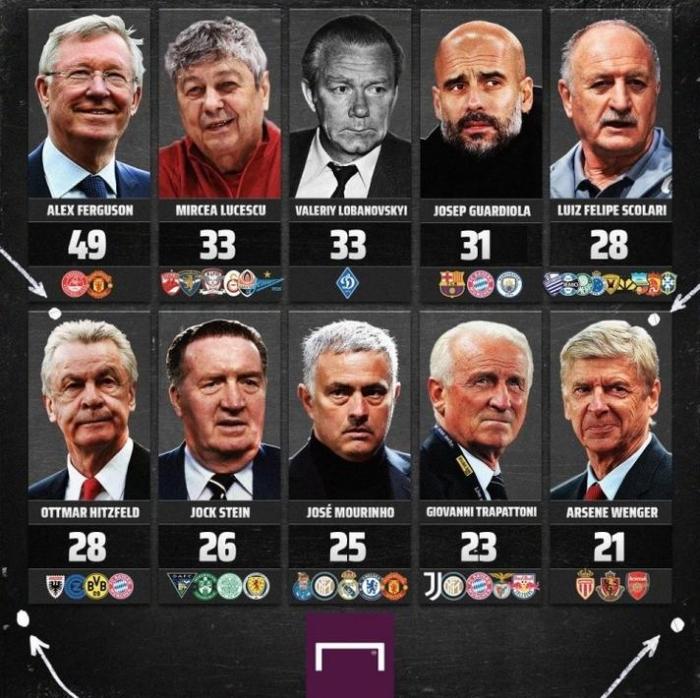 178直播讯进球网统计主教练冠军数,弗格森49冠高居榜首,瓜迪奥拉31冠排第四,穆里尼奥25冠第八,温格21冠第十。